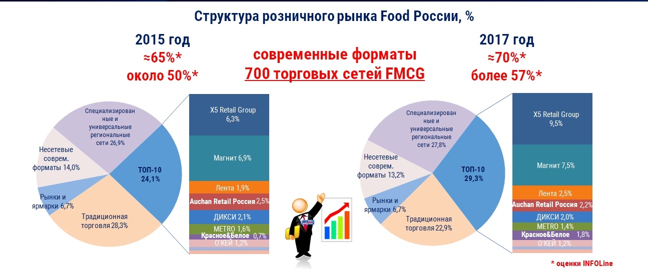 Рынок FMCG, как и рынки DIY, бытовой техники, потребительской электроники и мобильных устройств, по мнению специалистов INFOLine, перешел от фазы экстенсивного роста к фазе консолидации. Процесс консолидации происходит на фоне ужесточения конкуренции между крупнейшими сетями, высокой инвестиционной активности федеральных ретейлеров, роста специальных сетей в крупных городах и вытеснения менее эффективных региональных сетей. Все это существенно повышает порог входа в отрасль в будущем. Крупнейшие торговые сети FMCG TOP-10 (Х5 Retail Group, «Магнит», Auchan Retail Россия, «Лента», ГК «Дикси», Metro Group, ГК «О’КЕЙ», «Красное&Белое», Globus, «Монетка») занимают долю 29,3% в структуре розничного рынка Food России. «Российские компании FMCG стали конкурентоспособными, современными и могут оказывать серьезное противостояние, в том числе и международным ретейлерам. Подтверждением этому служит рейтинг, в котором впервые за долгие годы в ТОР-3 не осталось иностранных компаний. Торговая сеть «Лента» вышла на третье место, первое место занимает X5 Retail Group, второе – «Магнит». Таким образом, все лидеры сегмента FMCG – это национальные компании, что не характерно для других стран Европы, где международные ретейлеры смогли захватить рынки отдельных стран. По оценкам INFOLine, на начало 2018 года в России 70% розничного товарооборота в сегменте продуктов питания приходится на современные форматы», – отметил генеральный директор INFOLine Иван Федяков в ходе пресс-конференции.