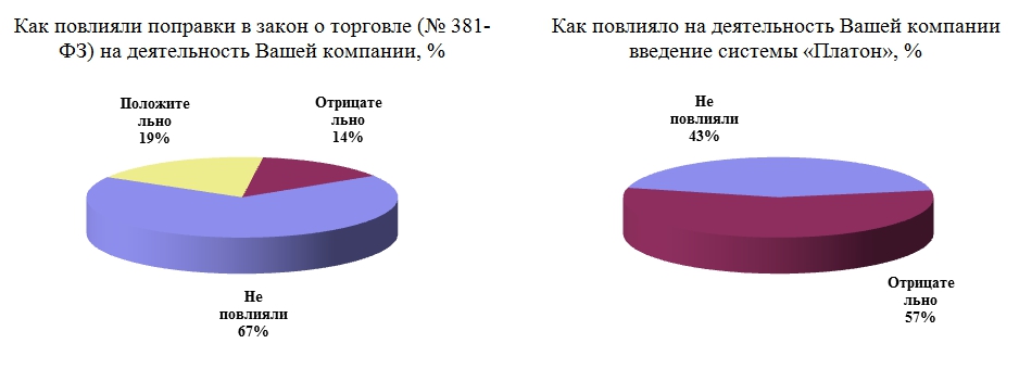 19% опрошенных поставщиков положительно оценивают влияние поправок в Закон № 381-ФЗ «Об основах государственного регулирования торговой деятельности в Российской Федерации» на деятельность компании. 67% респондентов отметили, что поправки в закон о торговле не повлияли на компанию, в то время как 14% опрошенных заметили отрицательное влияние. Негативное влияние введения системы «Платон» отметили чуть более половины опрошенных поставщиков - 57%, в то время как остальные 43% не заметили изменений.