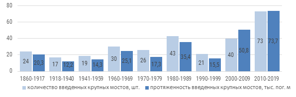 По подсчетам INFOLine, на территории России на начало 2019 года находится более 100 тыс. мостов, путепроводов и эстакад: 69257 объектов на дорогах федерального значения, 29350 – на дорогах общего пользования местного значения, 35807 на дорогах общего пользования регионального значения, 30580 железнодорожных мостов.