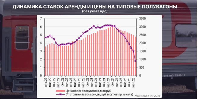 В ежеквартальном обзоре INFOLine специалисты отмечают стремительный характер падения цены за аренду грузовых вагонов: если в июле 2025 года средние ставки держались на уровне 1400-1500 руб., то к августу произошло новое масштабное снижение. Некоторые операторы со значительным объемом простаивающего парка вынуждены предлагать ставки ниже 900 руб. без НДС.