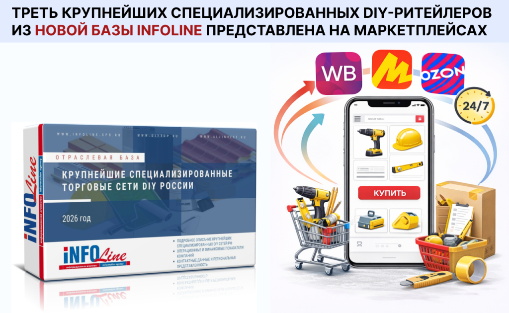Важной тенденцией развития торговых сетей DIY в 2026 году становится расширение онлайн-продаж, сообщают авторы новой базы "Крупнейшие специализированные торговые сети DIY РФ. 2026 год". По данным INFOLine, более 80 компании из реестра уже представлены на маркетплейсах.