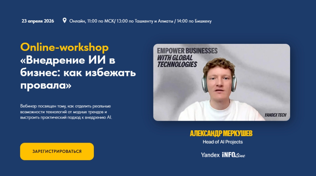 23 апреля 2026 года INFOLine и Yandex Tech проведут практический online-workshop «Внедрение ИИ в бизнес: как избежать провала». Мероприятие ориентировано на топ-менеджмент и руководителей, которые уже используют инструменты искусственного интеллекта для повышения эффективности работы или только планируют встраивать AI в бизнес-процессы своих компаний.