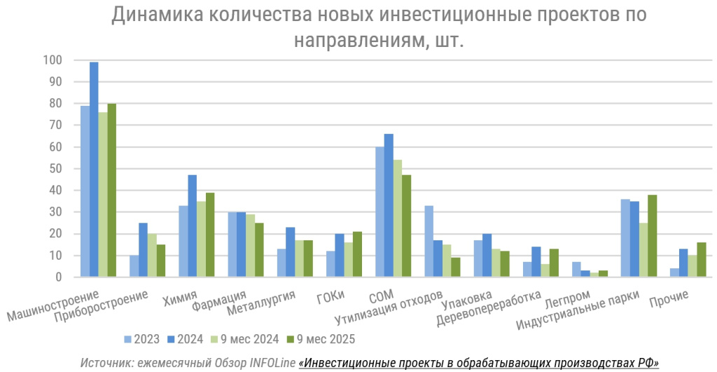 В 2025 году по итогам 9 месяцев зафиксировано снижение заявленных планов по инвестициям в строительство и реконструкцию обрабатывающих производств (с 3,2 до 2,7 трлн руб.), сообщают авторы ежемесячных и ежеквартальных обзоров строительной отрасли. При этом количество новых проектов увеличилось (с 545 до 575) по сравнению с аналогичным периодом 2024 года. Средний объем инвестиций в реализацию одного проекта снизился с 5,9 до 4,7 млрд руб. - при значительном росте стоимости оборудования, строительных и отделочных работ и материалов, что свидетельствует об удешевлении проектов.