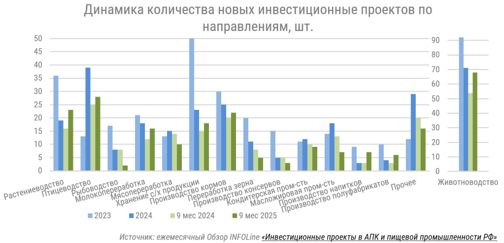 В основном рост числа проектов авторы summary обзоров INFOLine отмечают в животноводстве и растениеводстве, в том числе селекционном. Существенное снижение отмечено в разведении и переработке рыбы, масложировой промышленности. Новые проекты стоит ожидать в создании производств готовой еды и диетического питания, переработке молока, мяса и рыбы, производстве кормов для животных, а также в производстве продуктов, требующих импортозамещения.
