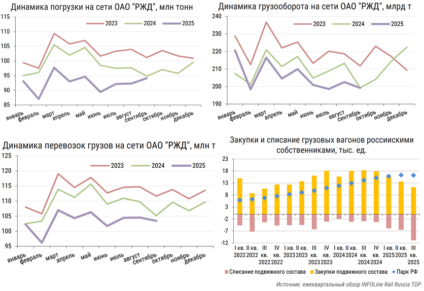 За сентябрь погрузка на сети РЖД сократилась на 3,3% и составила 91,4 млн т, следует из ежеквартального обзора INFOLine Rail Russia TOP. По итогам девяти месяцев показатель уменьшился на 6,7% до 830,2 млн т. Общий объем перевозок за январь-сентябрь 2025-го снизился на 5,2% до 930,1 млн т.