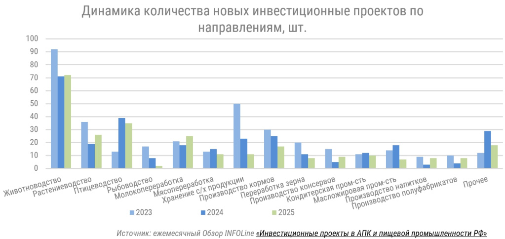 Увеличение числа проектов зафиксировано в производстве молочной продукции и растениеводстве, в том числе селекционном, тогда как существенное снижение наблюдается в разведении и переработке рыбы, масложировой промышленности.