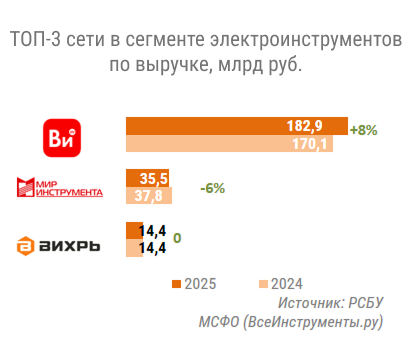 Безоговорочный лидер сегмента ВсеИнструменты.ру ежегодно активно наращивает количество своих фирменных магазинов - 1154 магазинов на начало 2026 г. Показатель выручки компании также демонстрирует ежегодный рост: по итогам 2025 г. он составил почти 183 млрд руб.
