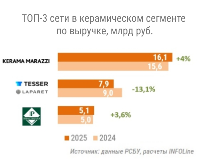Керамическая плитка. ТОП-3 в сегменте по выручке: KERAMA MARAZZI, TESSER/Laparet и Пиастрелла. Ведущая сеть сегмента – KERAMA MARAZZI на фоне сокращения общего числа собственных магазинов (327 точек в 2026 году против 347 в 2022-м в РФ и других странах) увеличила за последний год показатель выручки на 4% - до 16,1 млрд руб.