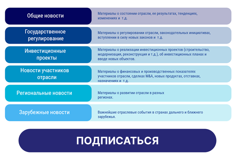 Ежедневно и еженедельно подписчики получают структурированную выборку важных новостей, сегментированных по определённой теме или отрасти как по РФ, так и по странам Центральной Азии и Кавказа. Вы можете выбрать одно или несколько направлений: