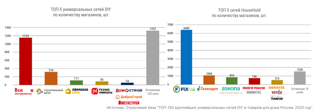 По данным отраслевой базы INFOLine, "ТОП-150 крупнейших универсальных сетей DIY и товаров для дома России", во второй половине 2025 года на ТОП-150 торговых сетей приходится более 14,3 тыс. магазинов суммарной площадью более 8 млн кв. м.