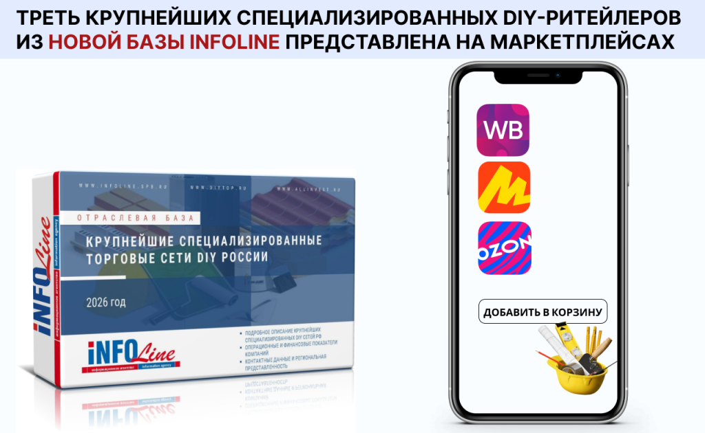 Важной тенденцией развития торговых сетей DIY в 2026 году становится расширение онлайн-продаж, сообщают авторы новой базы "Крупнейшие специализированные торговые сети DIY РФ. 2026 год". По данным INFOLine, более 80 компании из реестра уже представлены на маркетплейсах.