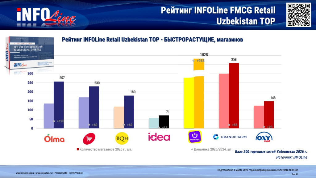 Существенный прирост торговых точек показали Korzinka.uz и ЯQН (+60 магазинов у каждого ритейлера), IDEA (+14), Grandpharm (+58) и OXYmed (+23), а также Uzum Market, который усилил присутствие за счет масштабного расширения сети пунктов выдачи и инфраструктуры электронной коммерции (+988 объектов).